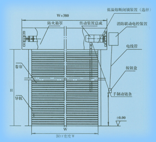 同防火墻的作用一樣起到水平防火分隔,它由簾板、座板、導軌、支座、卷軸、箱體、控制箱、卷門機、限位器,門楣、手動速放開關裝置、按鈕開關和保險裝置等13個部分組成,一般安裝在不便采用防火墻分隔的部位。如:敞開電梯廳、自動扶梯、百貨大樓的寬大營業廳、展覽樓的展覽廳和建筑物中洞口較大不能用防火門窗的部位。