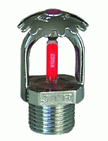 直立型噴頭是由噴頭框架、溫感元件、密封件、濺水盤等組成,其中噴頭框架是采用銅合金材質(zhì)的精密鍛壓、外表層進(jìn)行鍍鉻拋光的制造工藝,使其具有框架強(qiáng)度高、耐腐蝕性強(qiáng)、外觀精美的特點(diǎn)。溫感元件(玻璃球)具有動(dòng)作可靠,反應(yīng)速度快。密封件具有抗老化、耐腐蝕、密封性好的性能特點(diǎn)。直立型噴頭向下噴灑的水量為80%~100%。玻璃球的直徑為5mm[RTI 大于50(m·s)0.5且小于等于80(m·s)0.5]。依據(jù)玻璃球動(dòng)作的溫度不同而分為多種溫級(jí)噴頭。