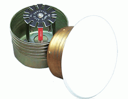 隱蔽式噴頭是由噴頭框架、溫感元件、裝飾片、支架、底托支架、密封件、濺水盤等組成,其中噴頭框架是采用銅合金材質的精密鍛壓、外表層進行鍍鉻拋光的制造工藝,使其具有框架強度高、耐腐蝕性強、外觀精美的特點。溫感元件(玻璃球)具有動作可靠,反應速度快。密封元件具有抗老化、耐腐蝕、密封性好的性能特點。隱蔽式噴頭玻璃球的直徑為5mm[RTI 大于50(m·s)0.5且小于等于80(m·s)0.5];3mm[RTI≤50(m·s)0.5],裝飾片與支架采用低熔點焊錫焊接(熔化溫度61℃±1℃)。將噴頭全部隱蔽在裝飾罩內。當火災發生時,裝飾片與支架之間的低熔點焊接金屬首先熔化,裝飾片脫落。當玻璃球溫度達到動作溫度時,玻璃球爆破,噴頭噴水滅火。